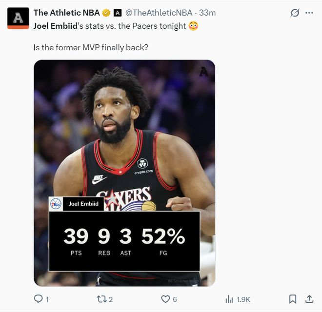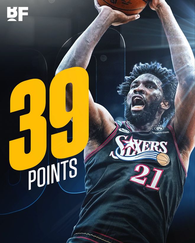 此役恩比德仅登场32分钟,23中12,三分8中2,罚球18中13,拿到39分9篮板3助攻1抢断,命中率52.2%,真实命中率63.1%,正负值+16,他的得分创造赛季新高,美媒NBA Central写道:大帝归位。