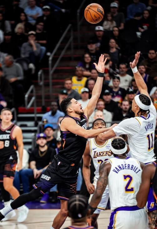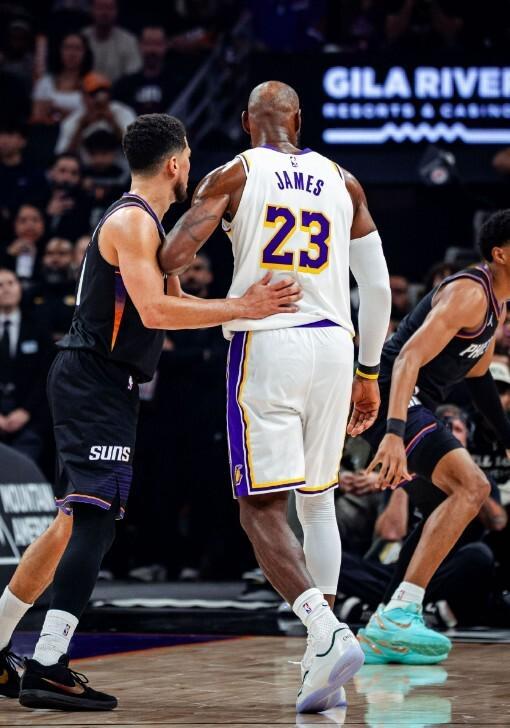 第二节中段湖人在詹姆斯和东契奇的带领下连追6分,5分48秒湖人追到49-50只落后1分。太阳连续得分再次拉开,布克的2+1让球队60-52领先8分。最后2分钟湖人打出10-2的追分高潮,半场结束双方62-62战成平局。