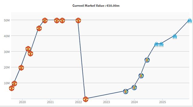 2023-24赛季,格林伍德被租借到赫塔菲,36场贡献10球6助。从零起步的格林伍德,身价不断上涨:500万、750万、1500万,去年夏天离开赫塔菲时,格林伍德已经打出2500万欧元的身价。在马赛1年半,青木57场36球10助,身价涨回到5000万欧元。